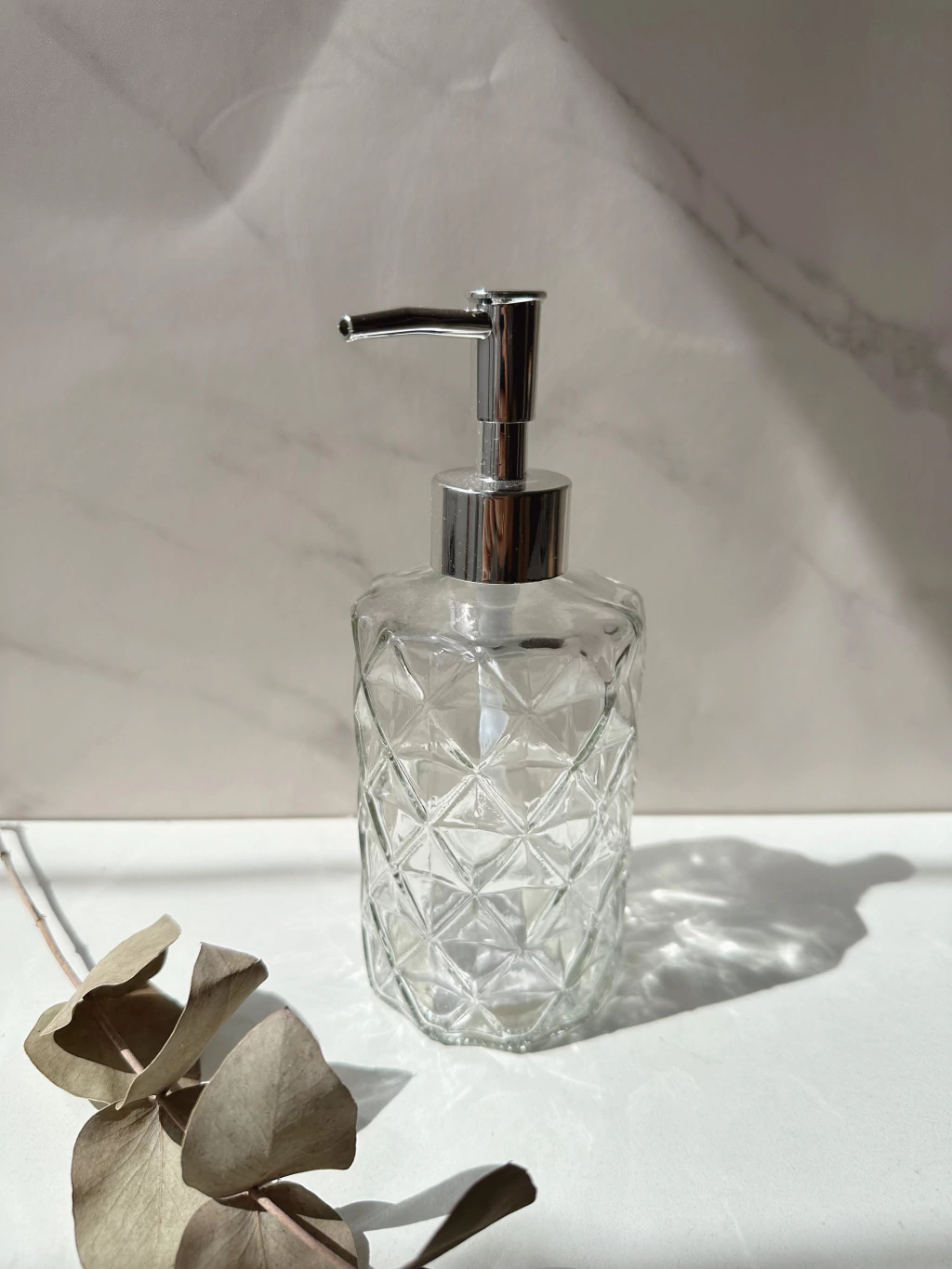 Descubre el Dispenser de vidrio calado con un elegante diseño de rombos que aporta un toque sofisticado a cualquier ambiente. Con su forma cilíndrica, este dispenser se destaca no solo por su estética, sino también por su funcionalidad.