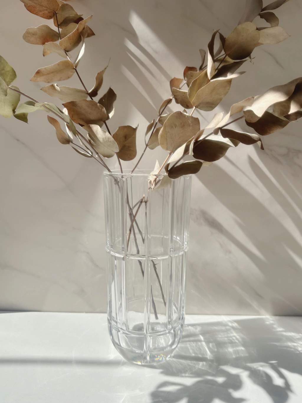 Florero Wolls Grande: Un toque de elegancia para tu hogar. Este florero de vidrio redondo presenta un diseño moderno con rectángulos que aportan un estilo único a cualquier ambiente.