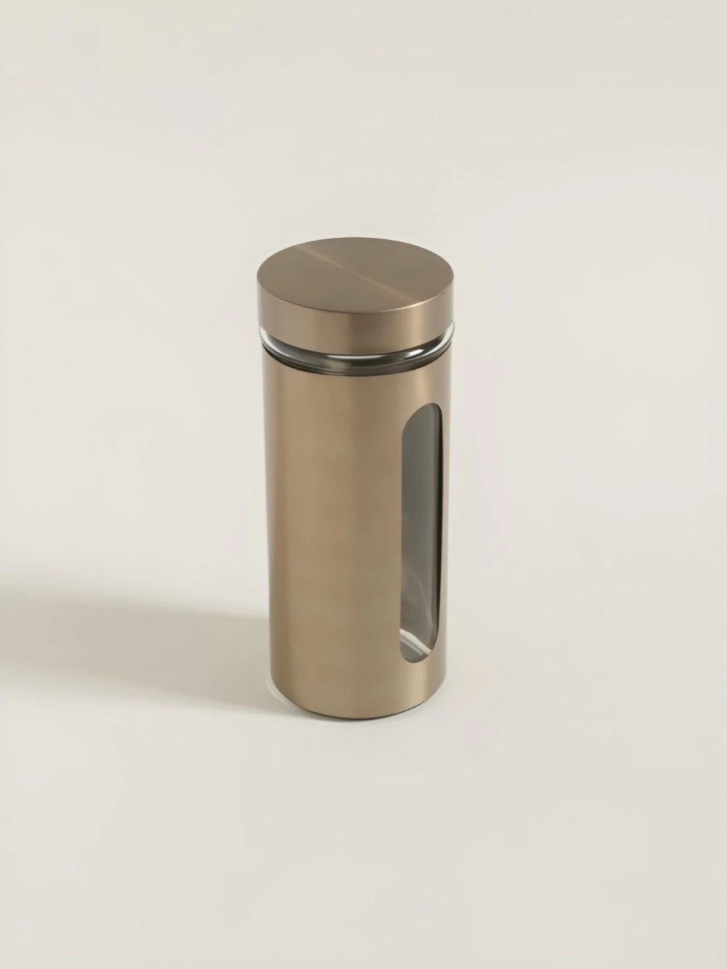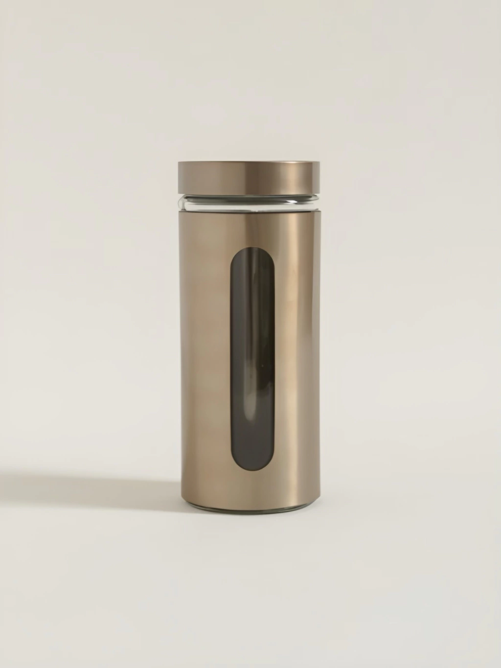 Frasco de vidrio grande con visor, cubierto en acero dorado y tapa a rosca. Esta linea de frascos es un clásico de siempre, que con su plus de color, le aporta gran distinción.