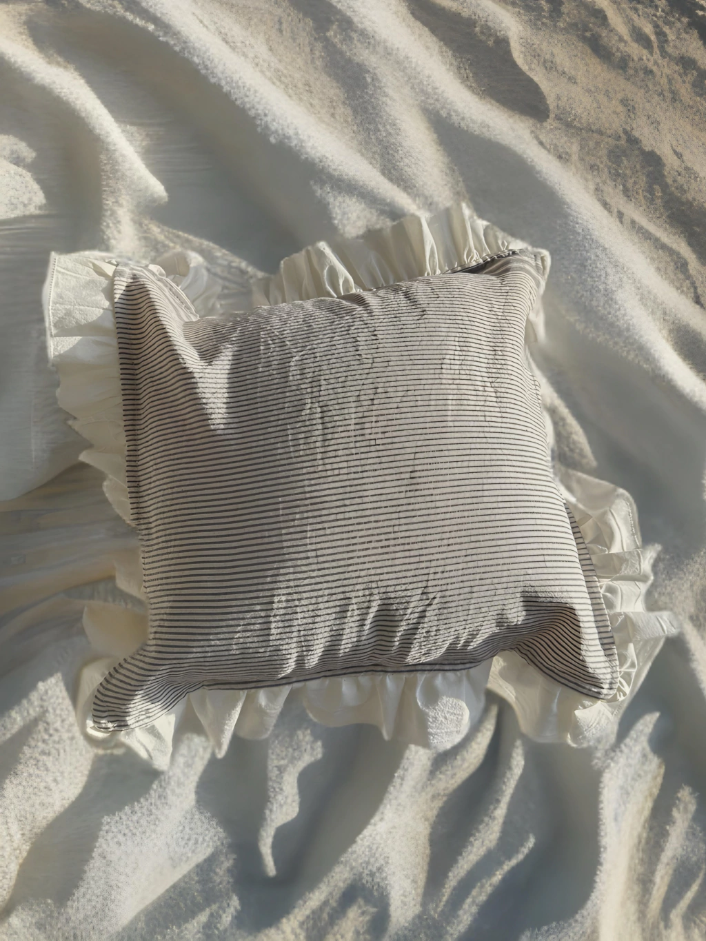 Renová tus espacios con esta funda de almohadón de tusor de algodón, de 40x40 cm. Con un diseño blanco con rayas grises y delicados volados blancos, es ideal para aportar un toque fresco y elegante a cualquier ambiente. Perfecta para decorar tu living, dormitorio o terraza. ¡Sumá textura y estilo a tu hogar con esta funda única!