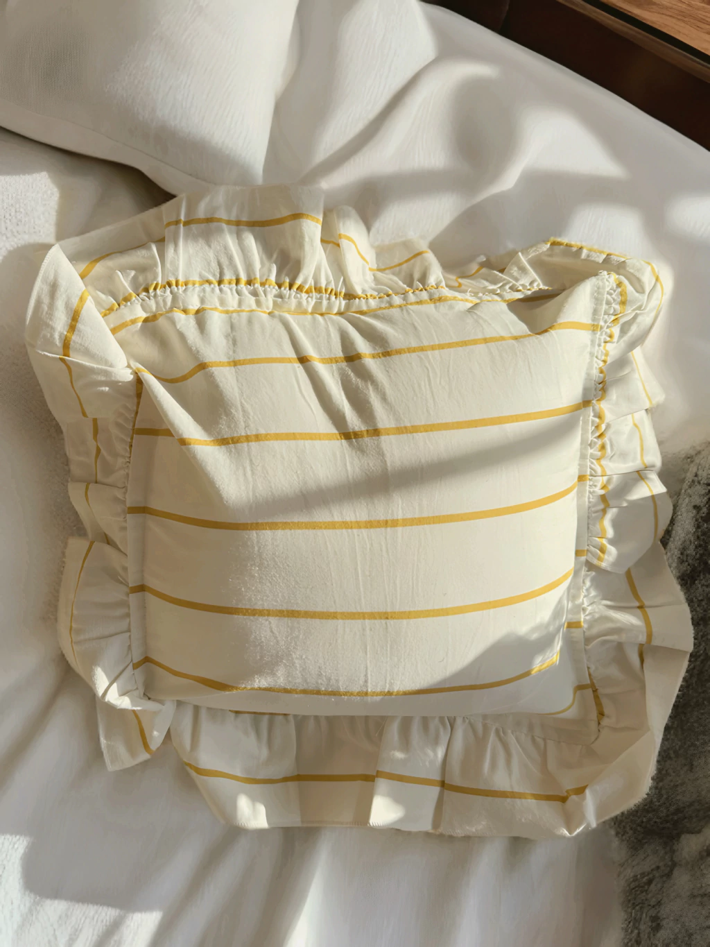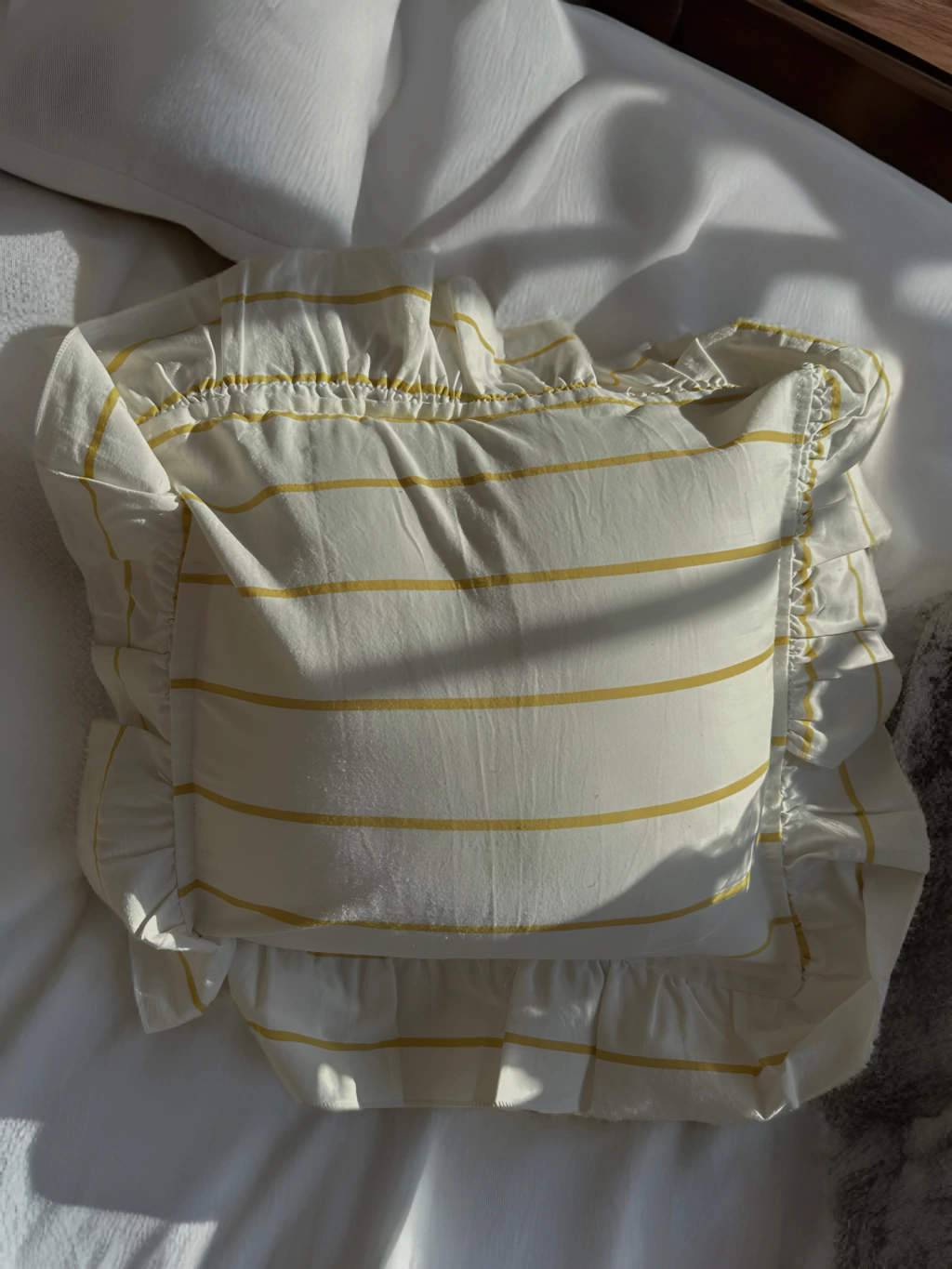 Renová tus espacios con esta funda de almohadón de tusor de algodón, de 40x40 cm más volados. Con un diseño blanco con rayas amarillo y delicados volados rayados, es ideal para aportar un toque fresco y elegante a cualquier ambiente. Perfecta para decorar tu living, dormitorio o terraza. ¡Sumá textura y estilo a tu hogar con esta funda única!
